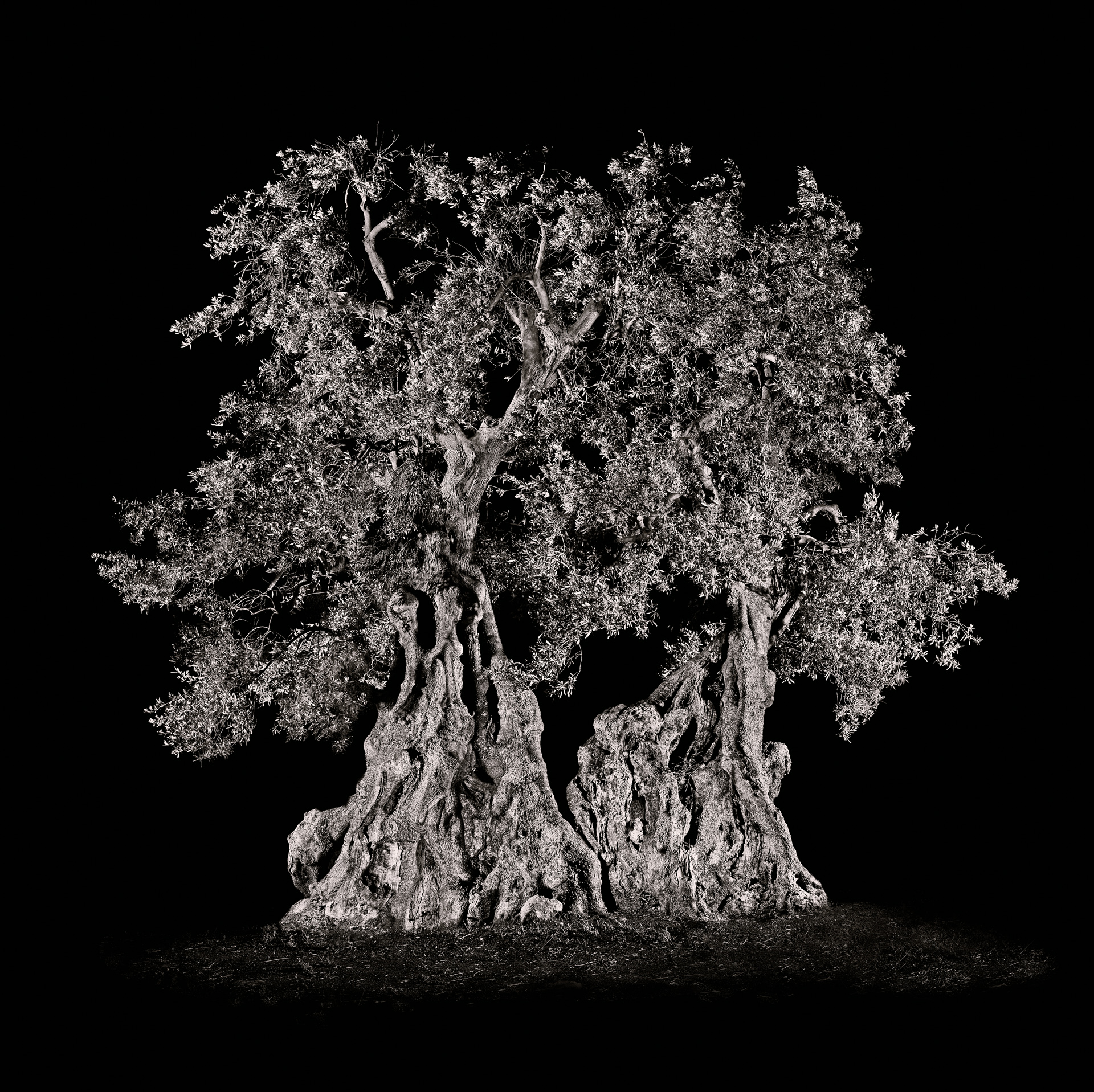 In Puglia, he photographed ancient olive trees, shaped by time and care. Waiting for nightfall, he assembled their portraits leaf by leaf, trunk by trunk, until each tree emerged as a sculptural being. No longer just landscape, the tree becomes a silent figure, confronting us with its age, inviting us to see and recognize other forms of life.