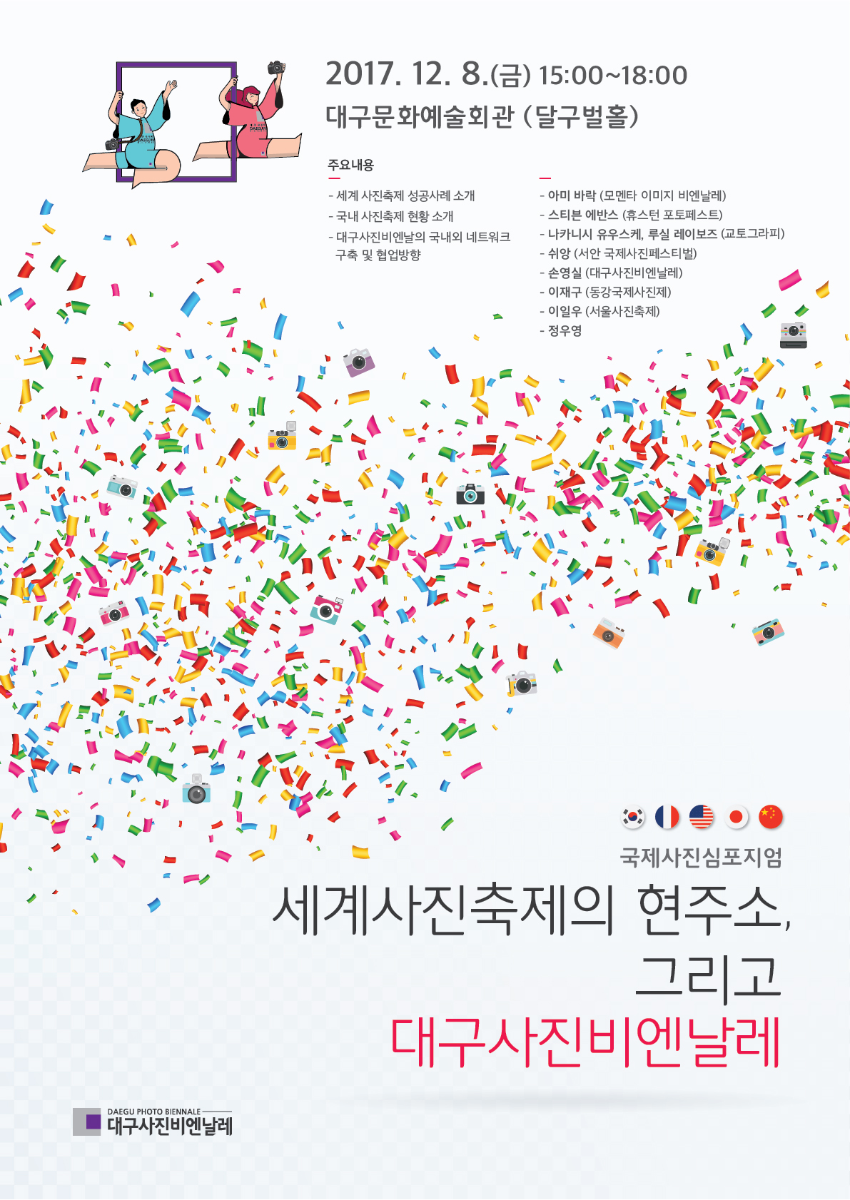 세계 사진축제의 현주소, 그리고 대구사진비엔날레 휴스턴 포토페스트 등 세계사진축제의 감독 등 책임자 방한 대구문화예술회관으로 운영주관 변경 후 세계적인 수준의 심포지엄 개최 ○ 대구사진비엔날레를 주관하는 대구문화예술회관에서 첫 공식 행사로 국제사진심포지엄 <세계 사진축제의 현주소, 그리고 대구사진비엔날레>를 오는 12월 8일(금) 오후 3시에 대구문화예술회관 달구벌홀에서 개최한다. ○ 특히 이번 행사는 그동안 한국 사진계에서 유래를 찾아볼 수 없는 대규모 심포지엄으로 세계 3대 사진축제로 손꼽히는 미국의 <휴스턴 포토페스트>를 비롯하여, 일본의 <교토그라피>, 중국의 <서안 사진축제> 등 세계적인 사진축제의 감독들이 방한하여 발제자로 참여한다. ○ 심포지엄은 1부와 2부로 나뉘어 진행되며, 1부에서는 캐나다 모멘타이미지비엔날레에서 <올해의 큐레이터>로 선정된 세계적인 큐레이터 아미 바락 (프랑스)이 해외 사진축제와 비엔날레의 성공 사례를 소개하고, 이어서 미국 휴스턴 포토페스트의 스티븐 에반스 감독과 일본 교토그라피 유우스케 나카니시 와 루씰 레이보즈 공동 감독, 중국 서안국제사진페스티벌의 슈 양 감독이 사진축제의 성공사례를 발표 한다. ○ 심포지엄 2부에서는 경일대학교 손영실 교수가 대구사진비엔날레의 발전방안을 주제로 발표하고, 이어 동강사진마을 운영위원장 이재구 경성대 교수와 서울사진축제 이일우 감독이 패널로 참여하여 국제 사진축제의 교류와 협력에 관한 토론을 진행한다. ○ 이번 심포지엄은 지난 2014년 휴스턴 포토페스트와 MOU를 맺은 대구사진비엔날레가 국내최대의 사진행사를 넘어 국제적인 사진축제로 발돋움하기 위해 세계의 사진축제들과 국제적인 네트워크를 구축하기 위해서 기획되었다. 대구문화예술회관 최현묵 관장은 “이번 국제사진심포지엄을 발판으로 삼아 대구사진비엔날레가 2020년을 기점으로 세계 최대의 사진축제의 반열에 오를 것을 기대한다.”고 밝혔다. ○ 참석 대상은 사진, 미술 등 시각예술 관련 학생 및 전문인은 물론 사진에 관심 있는 일반인 누구나 참여할 수 있다. 심포지엄은 무료로 진행되며, 특별한 예약절차 없이 현장에서 무료입장이 가능하다. ○ 한편 지난 2006년 최초 시작된 대구사진비엔날레는 작년까지 6회 행사를 치렀으며, 올해 6월 ‘대구사진비엔날레 육성조례안‘이 통과된 후에 대구시 대구문화예술회관으로 운영주체가 변경되어 2018년 행사를 준비하고 있다.