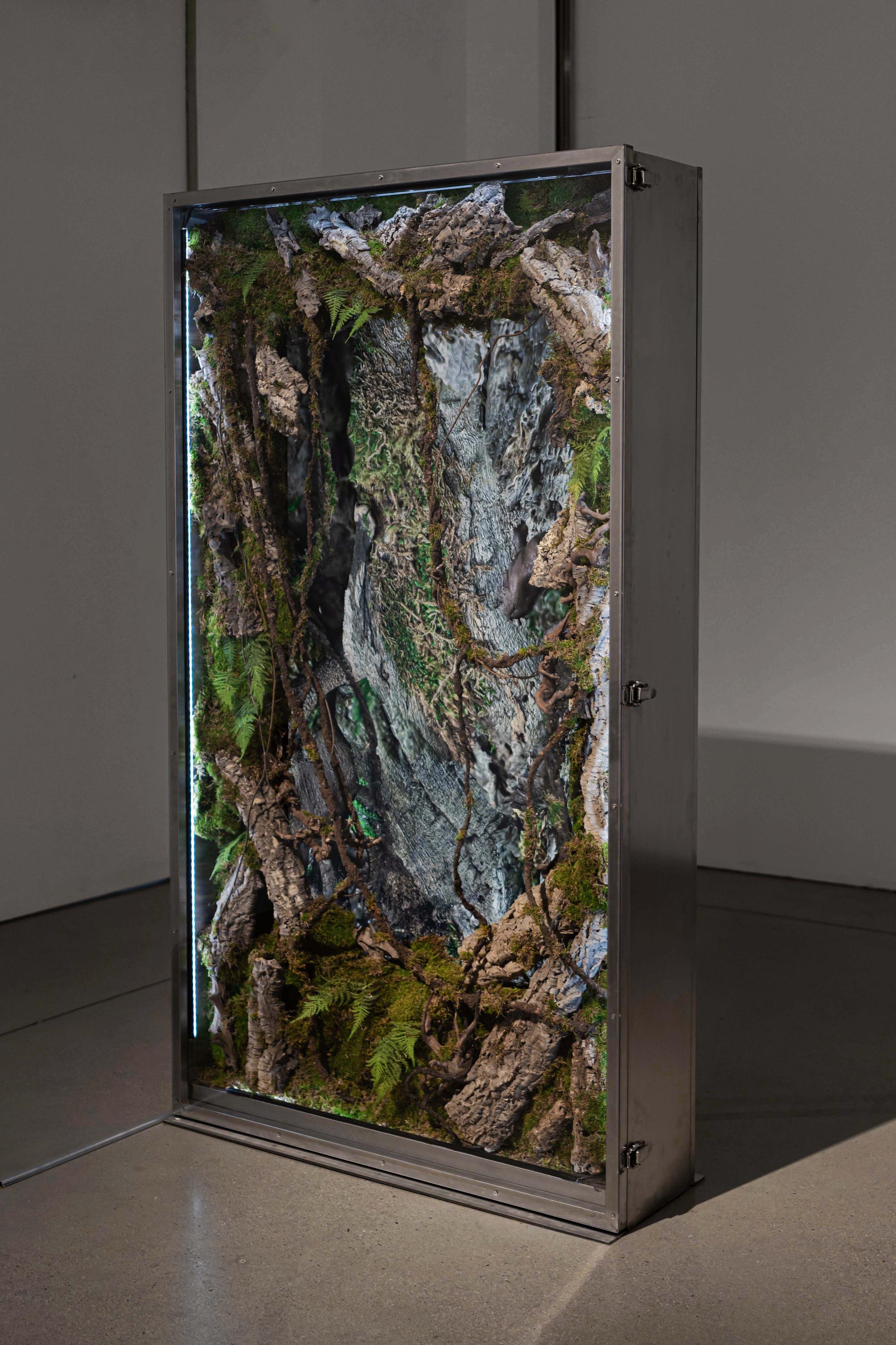A deep realm where no shadows draw combines the artificial ecosystem of a terrarium with digital technology, presenting a complex landscape that evokes unfamiliar sensations as reality and illusion penetrate each other. Images photographed from actual nature are transformed and expanded through 3D rendering and displacement mapping techniques, while the dead branches and preserved moss inside the terrarium disrupt the boundaries between nature and artifice, life and non-life. GOO appropriates the ways in which digital sensibility restructures reality, inserting heterogeneous tensions and subtle fissures within familiar images of nature. Through this, viewers are positioned to contemplate in multiple layers the contemporary environment where the real and the artificial, nature and technology are intertwined.