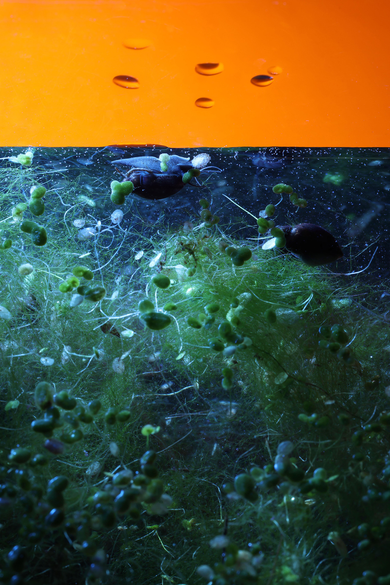 〈Anoxie verte〉(2024)에서는 산소가 결핍된 환경에서 유기물이 분해되고 일부 생명체가 살아남는 진화 중인 미세 생태계를 탐구한다. 팔로가 사용하는 인공 조명은 이 환경에 거의 공상과학적인 분위기를 부여한다. 보이지 않던 생명체들이 어둠 속 생태계의 중심 주제로 떠오른다.